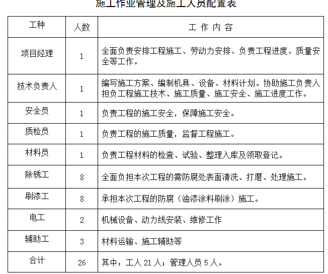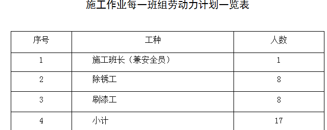 為保證能夠保質(zhì)保量按期完成本次工程,必須配備足夠的管理人員和施工人員,如遇不可抗拒的情況,應(yīng)隨時(shí)增加管理人員及施工人員。本次施工預(yù)計(jì)配備2個(gè)施工班組(具體施工人員數(shù)量依據(jù)甲方要求工期確定,以滿足施工工期為準(zhǔn)),各施工班組勞動(dòng)力計(jì)劃如下: